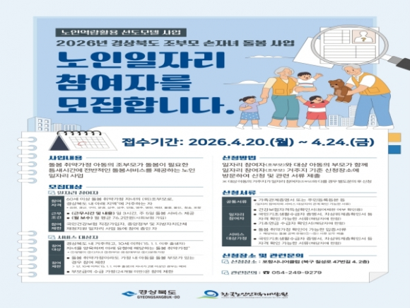 참여를 희망하는 조부모와 대상 가정은 포항시니어클럽을 방문해 신청할 수 있으며, 소득 수준과 돌봄 필요성, 참여자의 활동 역량 등을 종합적으로 평가해 최종 선발한다.